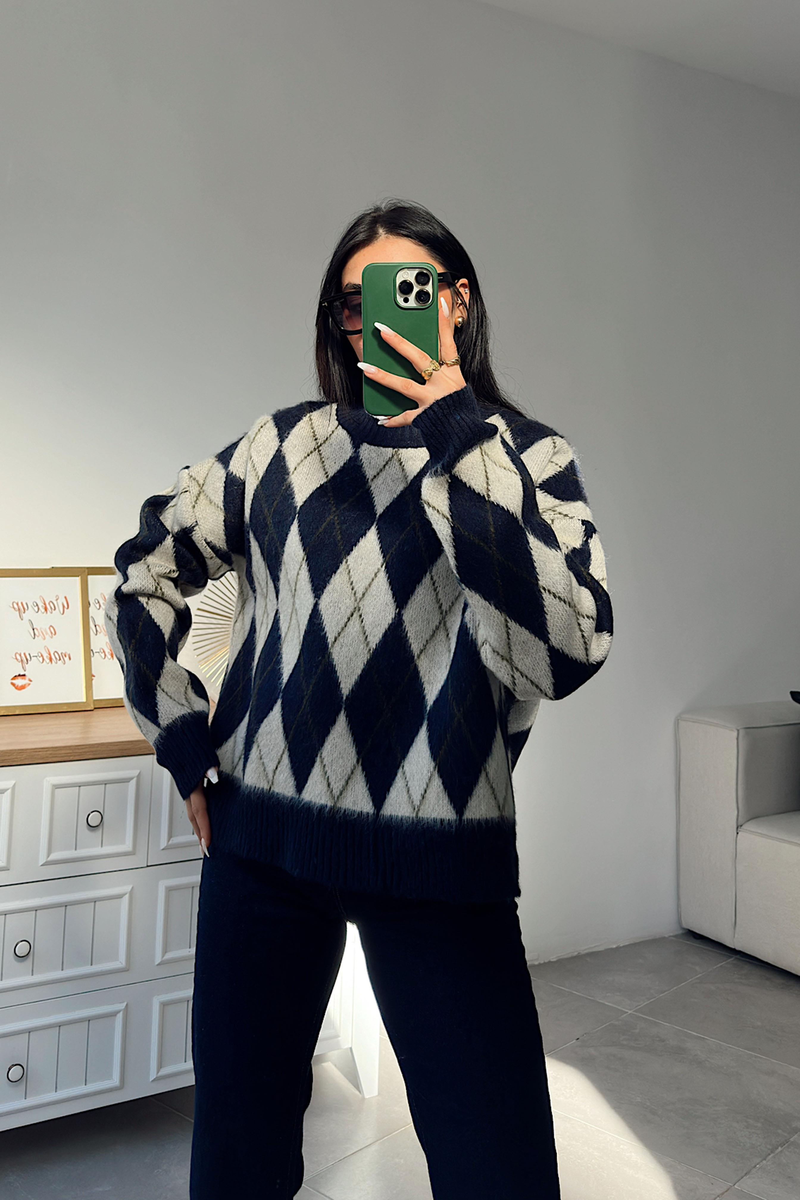 Baklava Desen Yumoş Triko Kazak Lacivert (FWKZK00228)