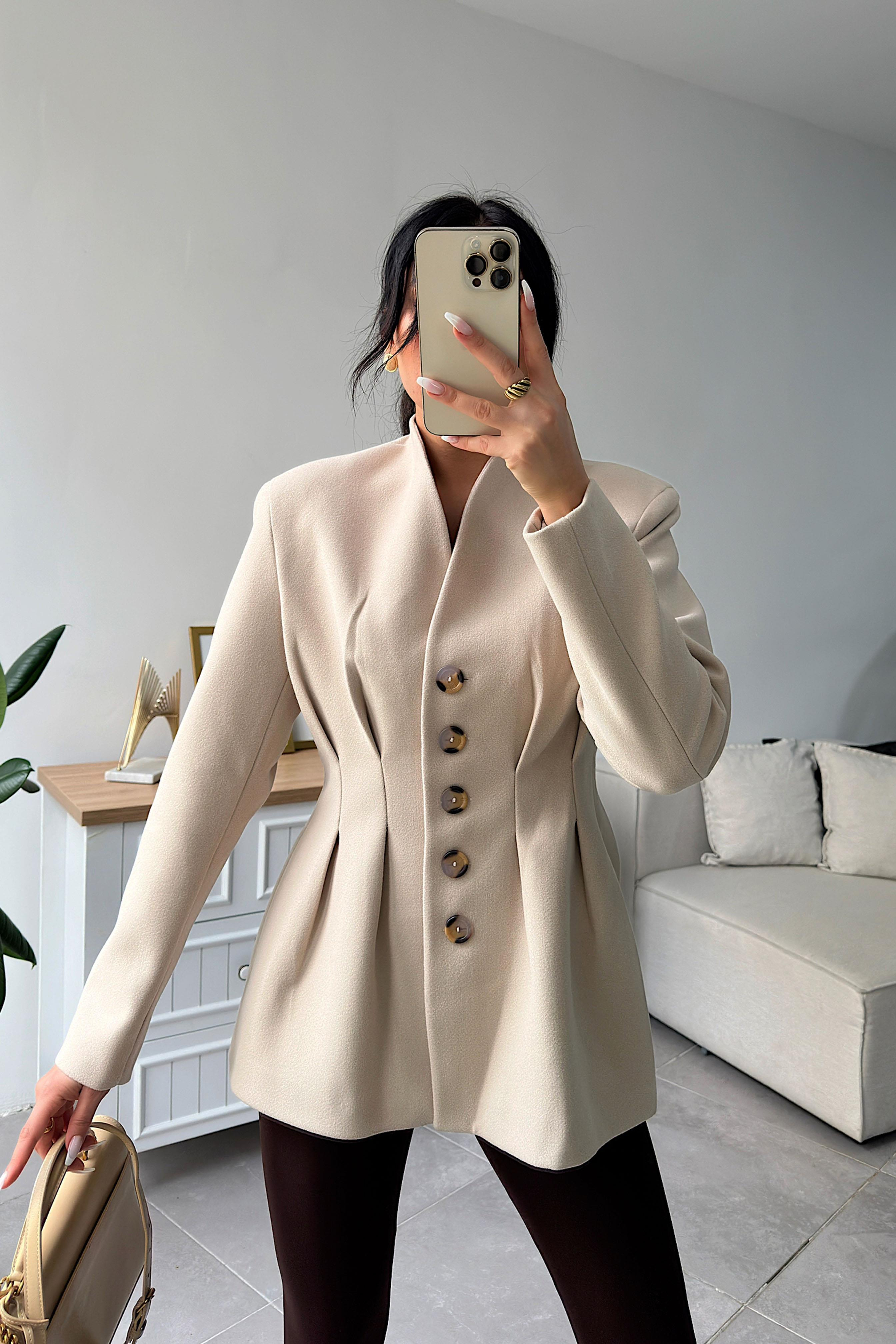 Beli Pens Detay Düğmeli Kaşe Ceket Taş (FWCKT00086)