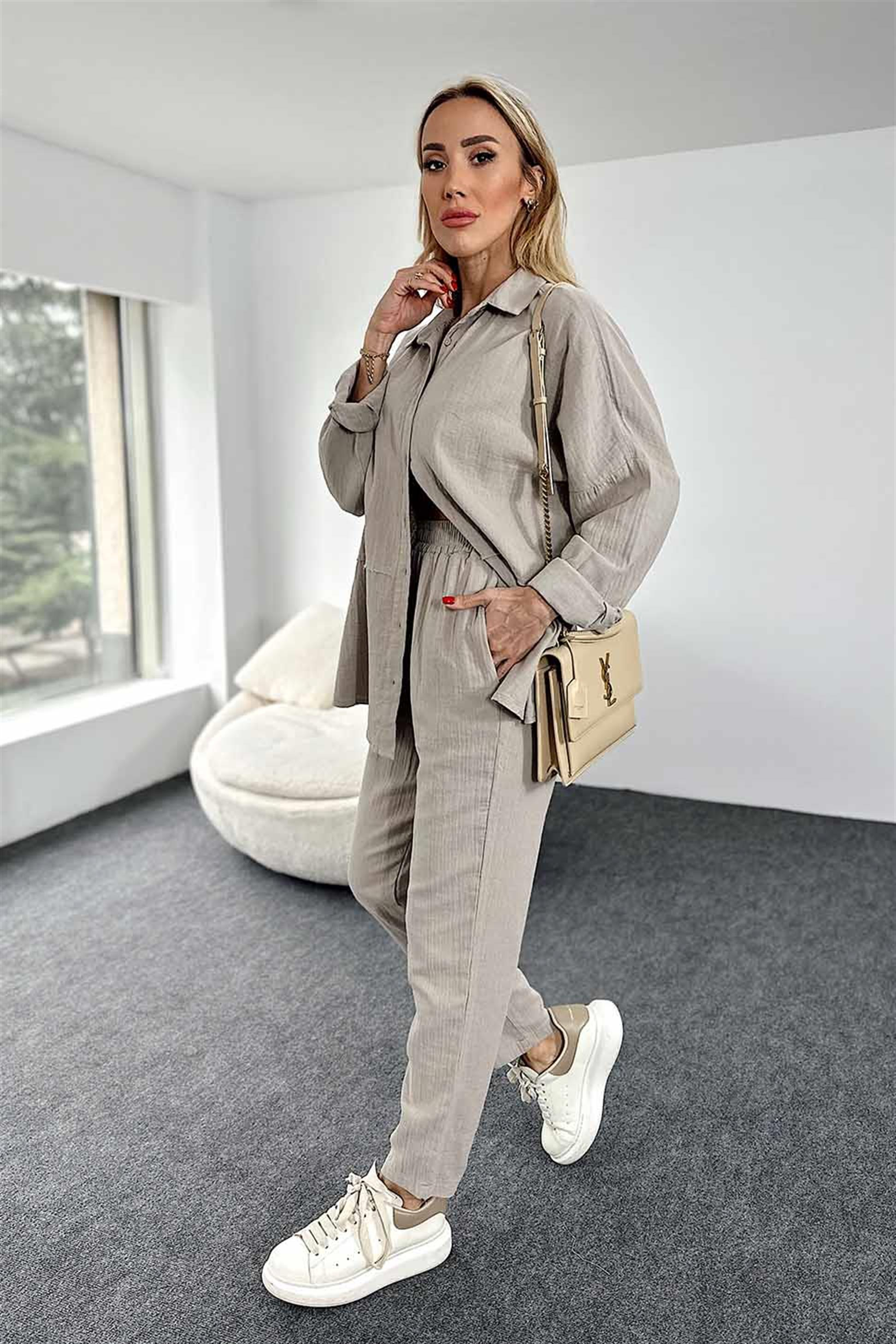 Keten Kumaş Gömlek Pantolon İkili Kadın Takım Vizon
