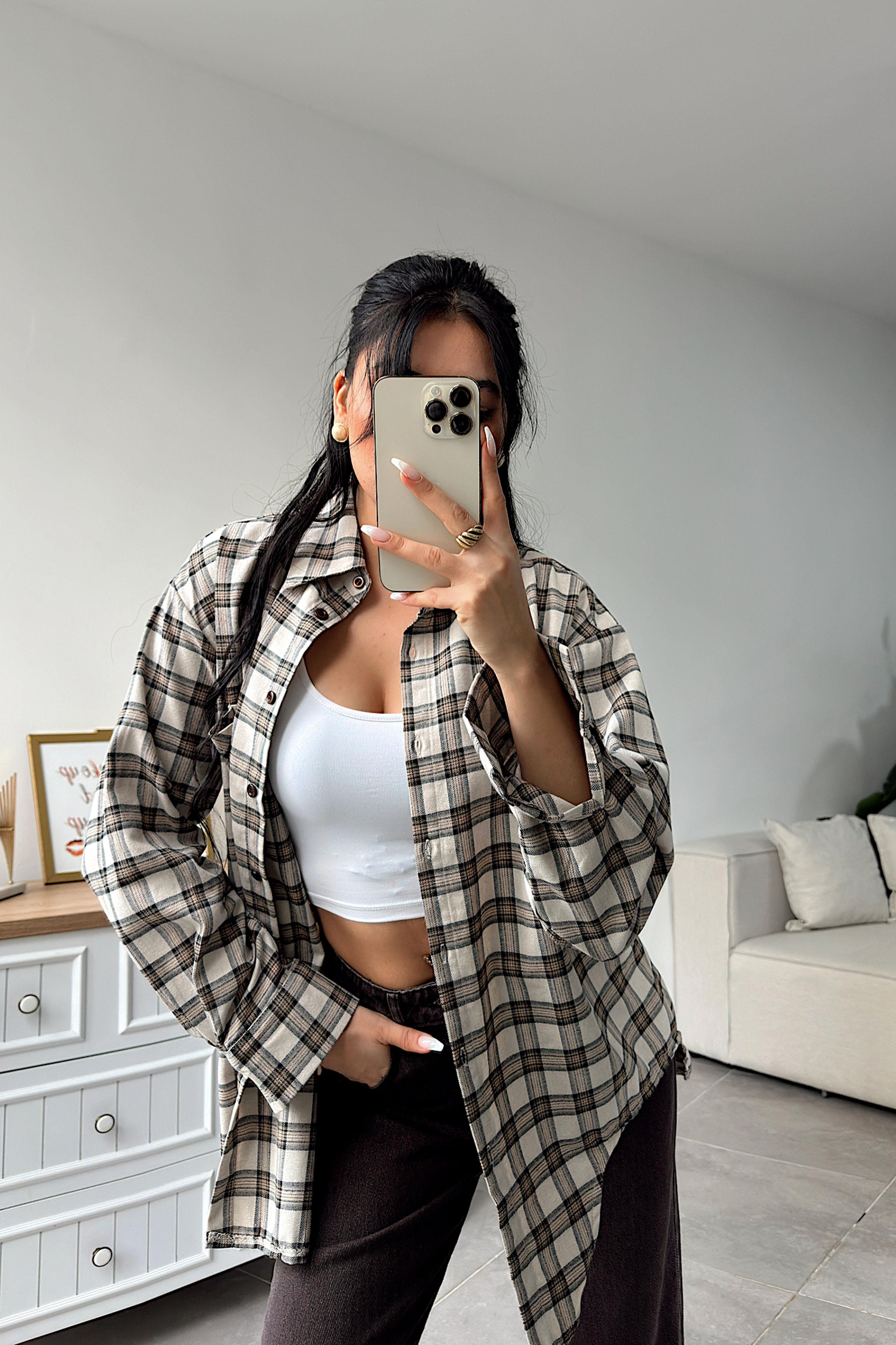 Lüks Kalite Ekose Gömlek Krem