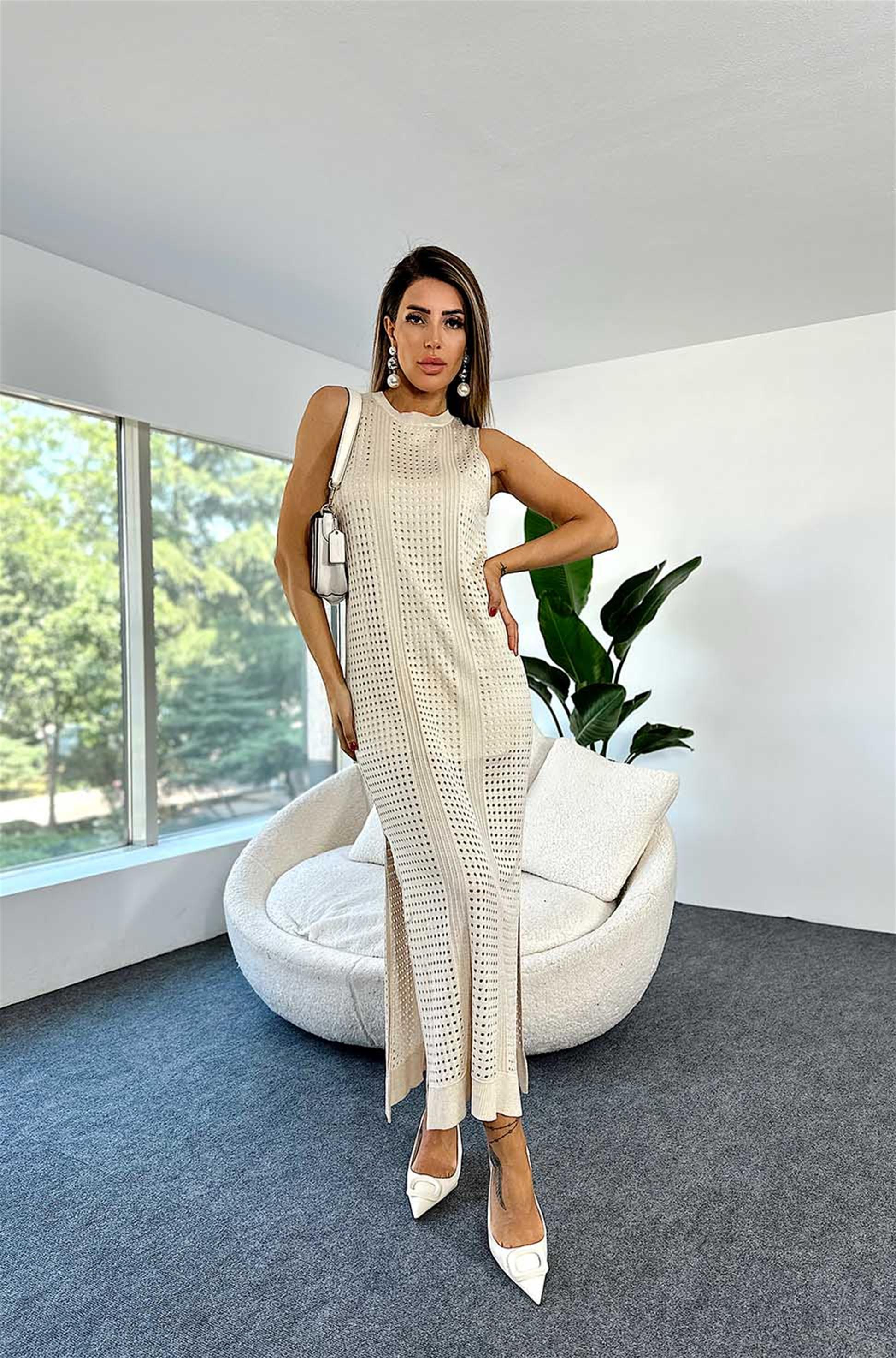 Nisan Marka Yırtmaç Detay İçi Full Astarlı Delikli Triko Elbise Taş