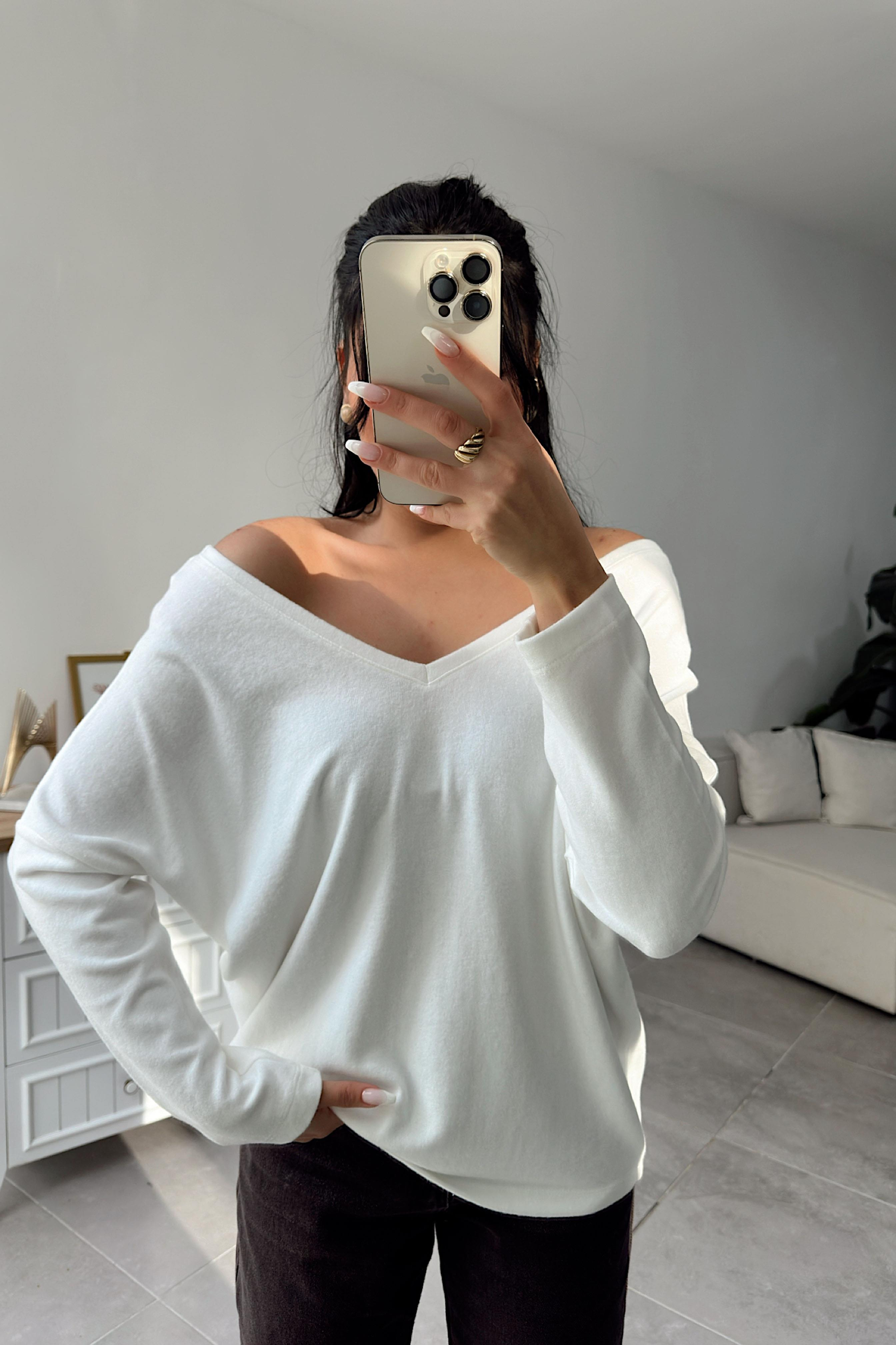 Ön Arka V Yaka Uzun Kol Yumoş Bluz Ekru