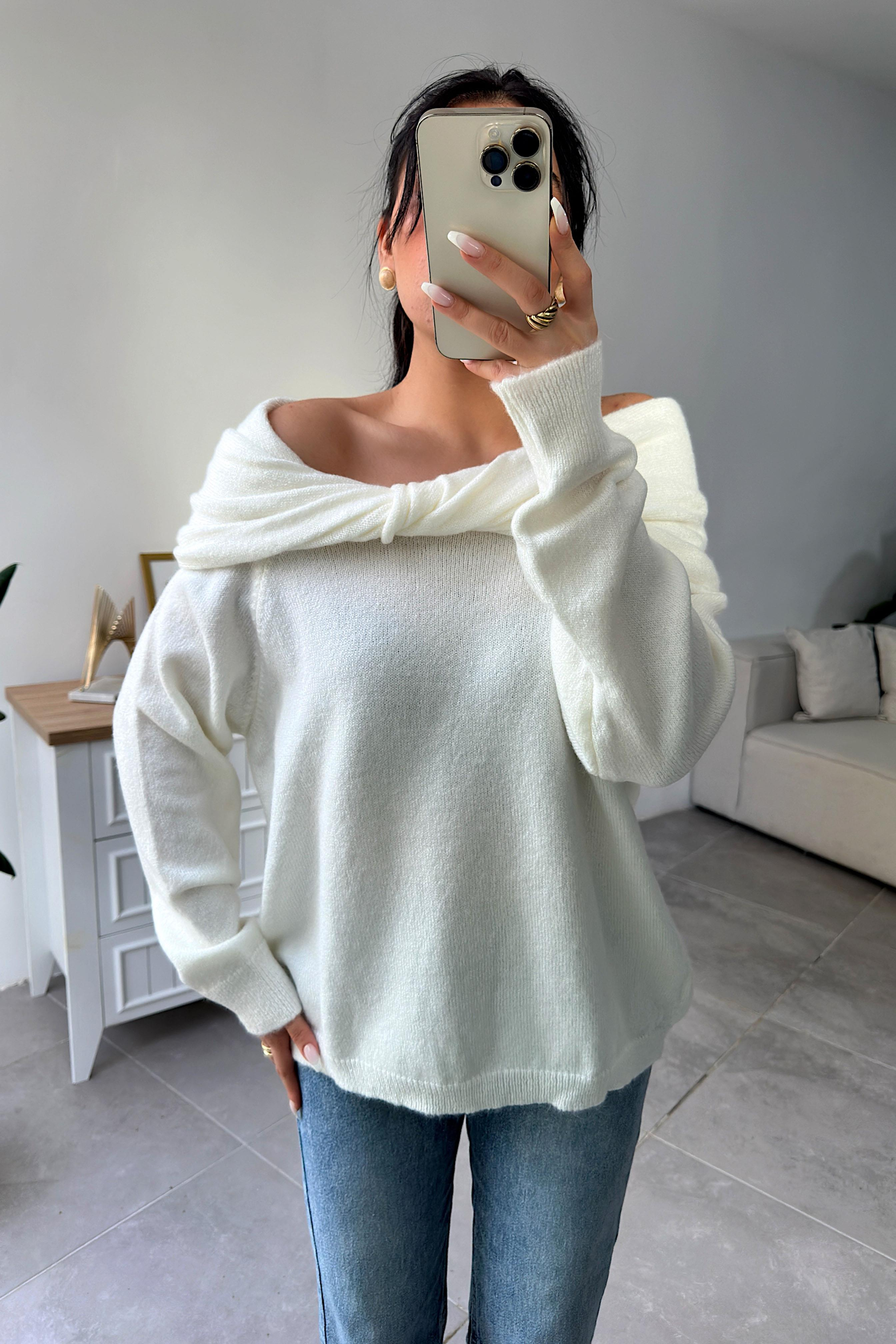 Premium Seri Degaje Yaka Triko Kazak Ekru