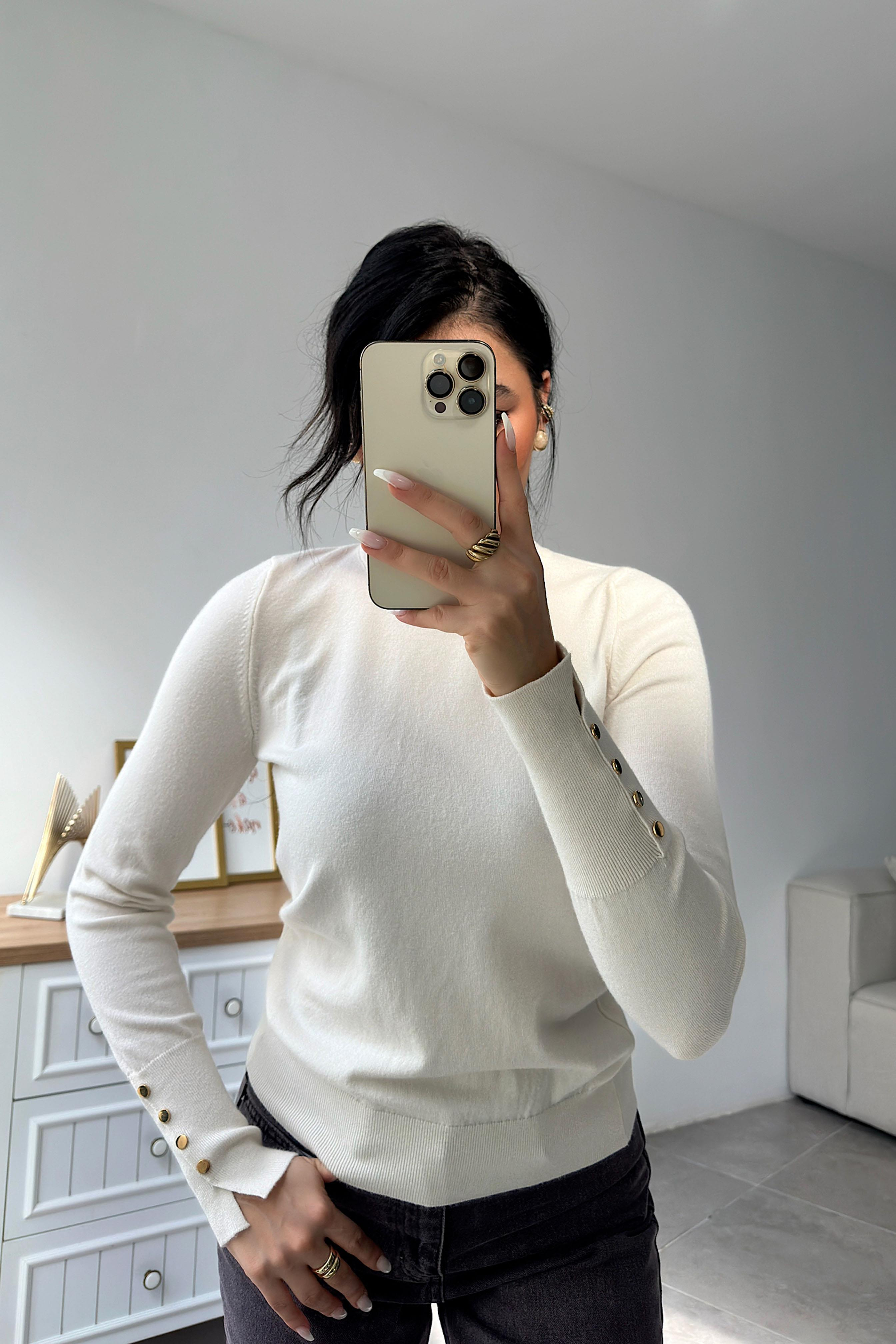 Premium Seri Kolu Gold Düğme Detay İnce Triko Kazak Ekru