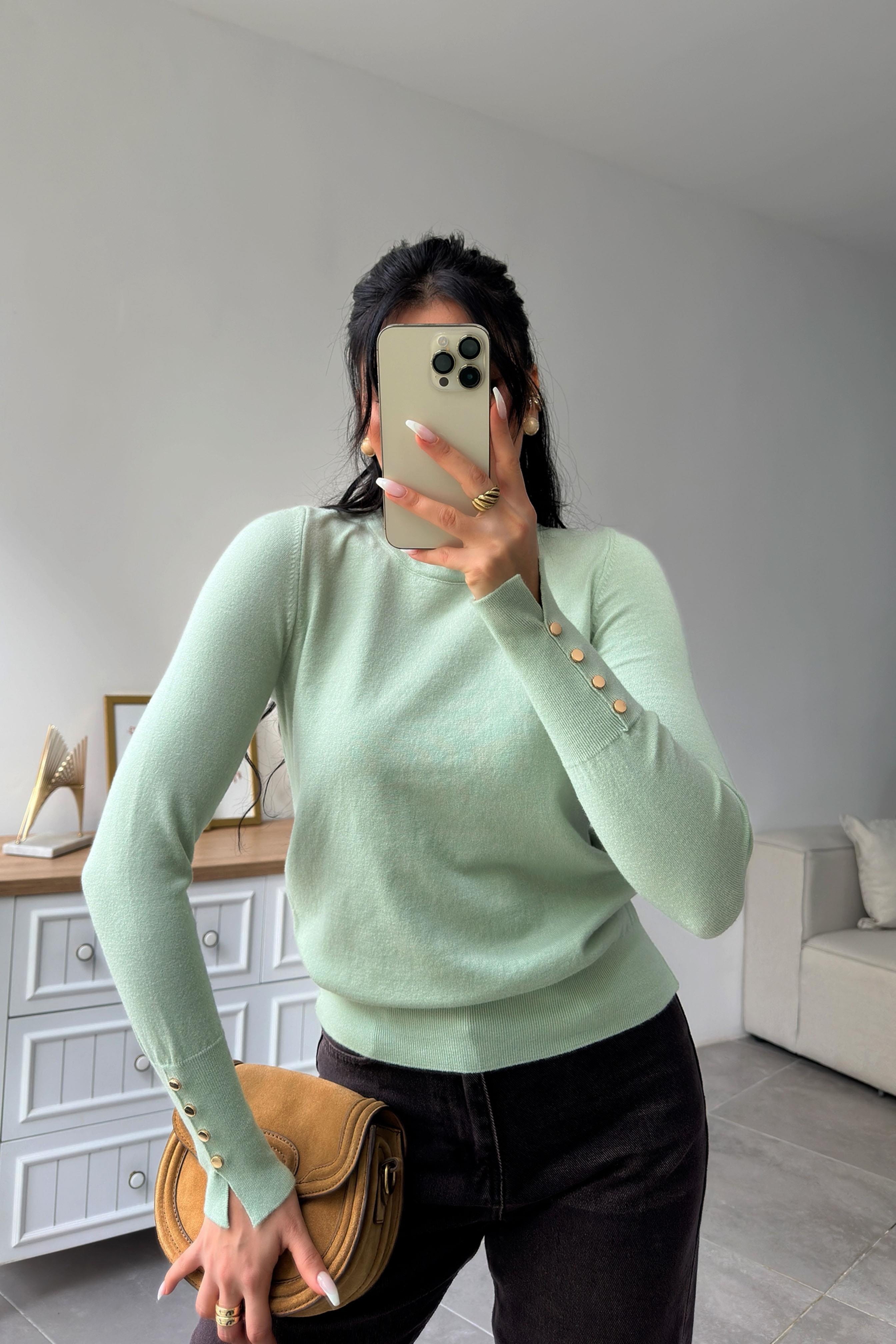Premium Seri Kolu Gold Düğme Detay İnce Triko Kazak Mint