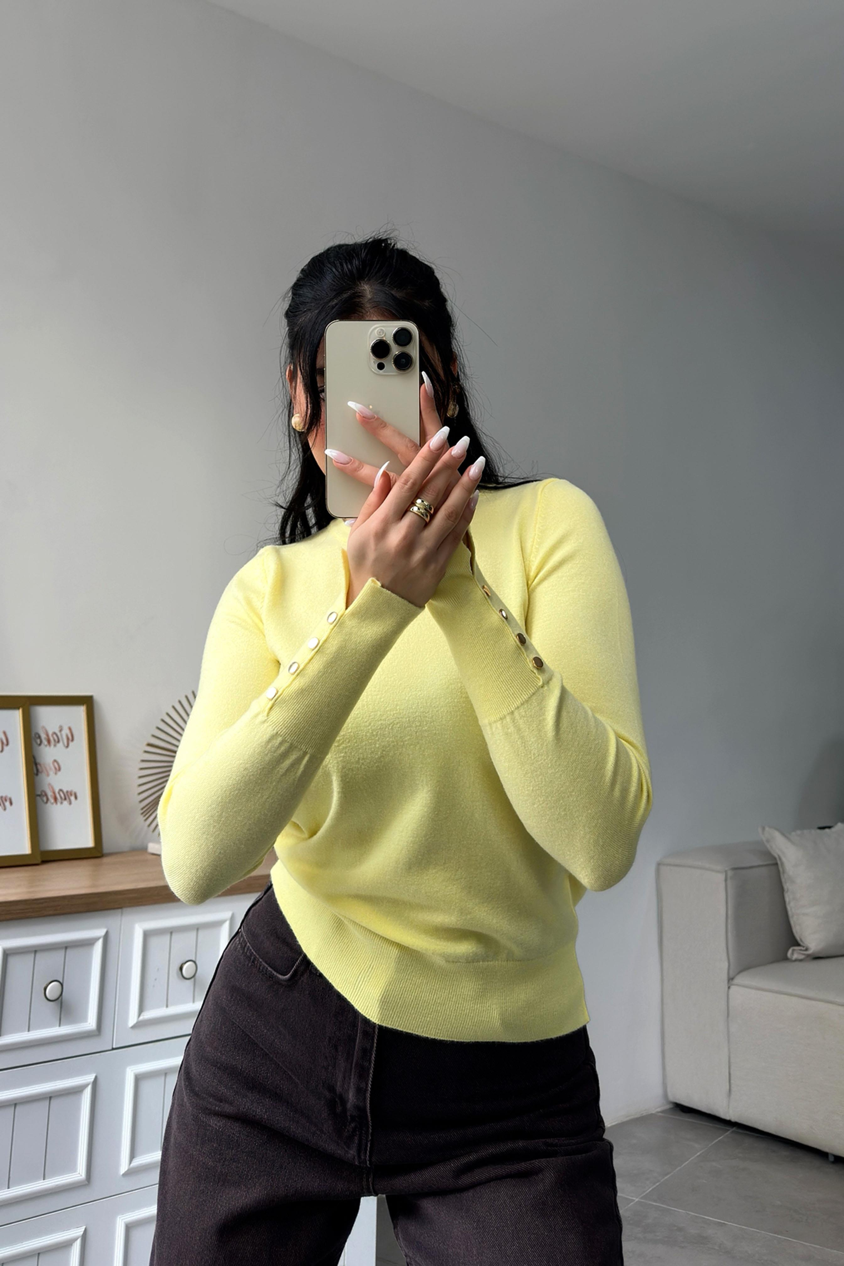 Premium Seri Kolu Gold Düğme Detay İnce Triko Kazak Sarı