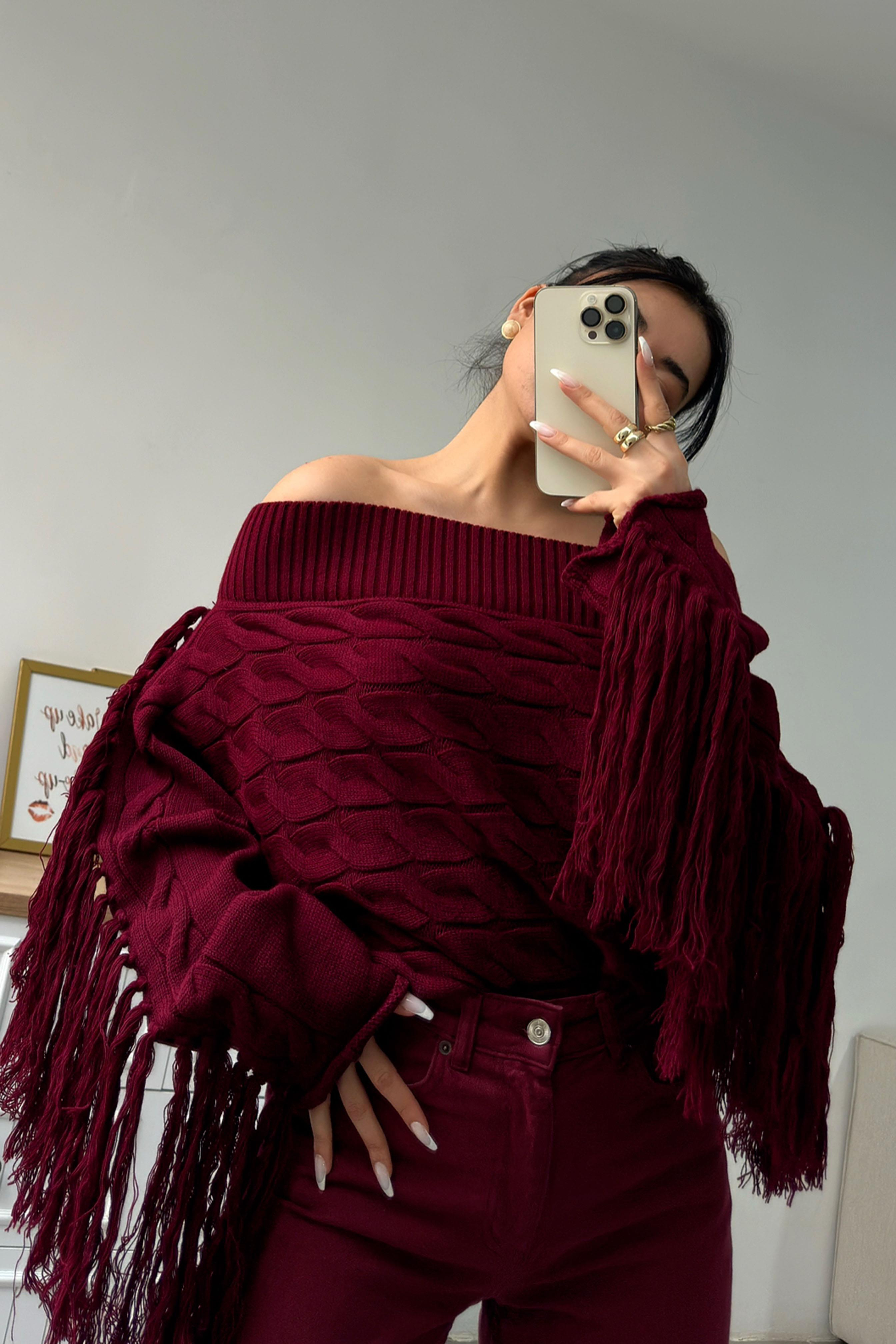 Premium Seri Madonna Yaka Püsküllü Kazak Bordo (FWKZK00223)