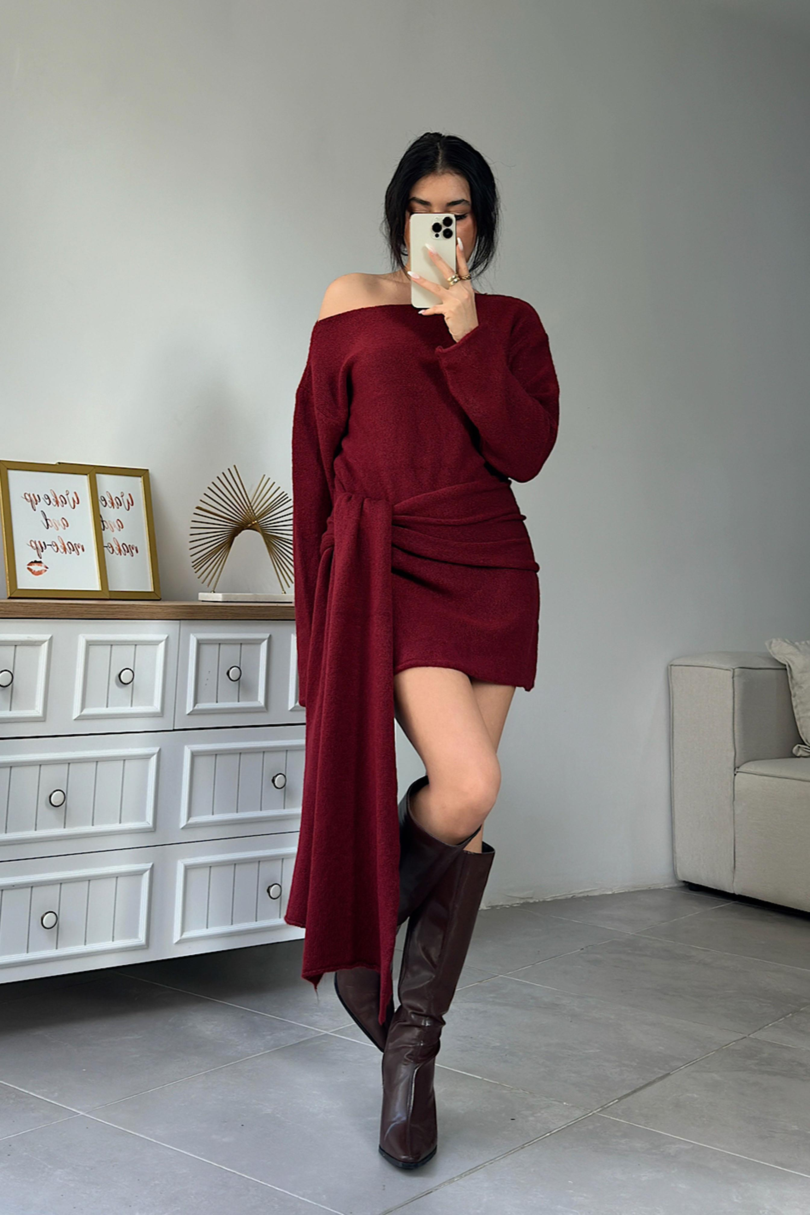 Premium Seri Tek Omuz Kuşak Detaylı Mini Triko Elbise Bordo (FWELB00103)