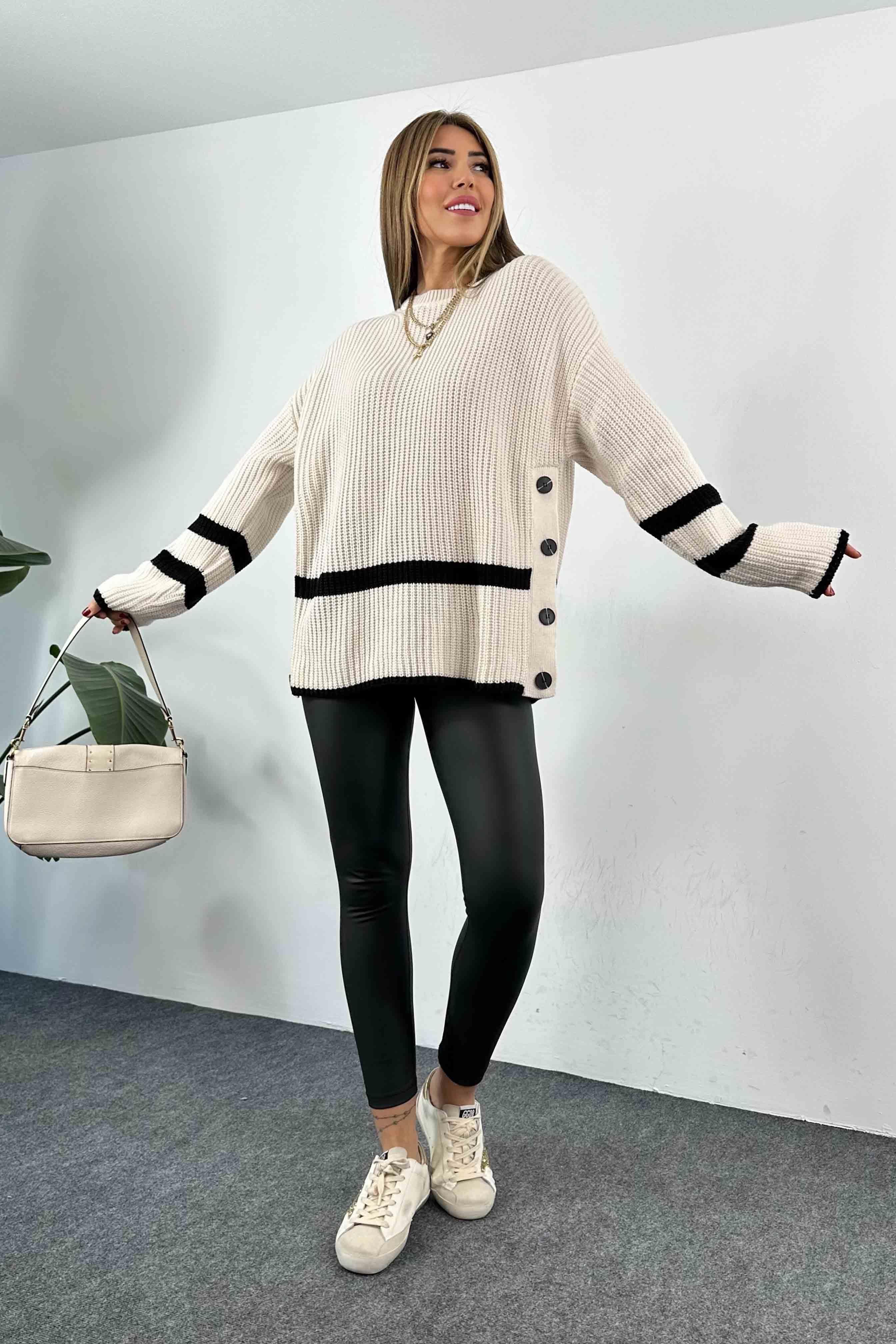 Selanik Örme Yanlardan Düğmeli Kazak Ekru
