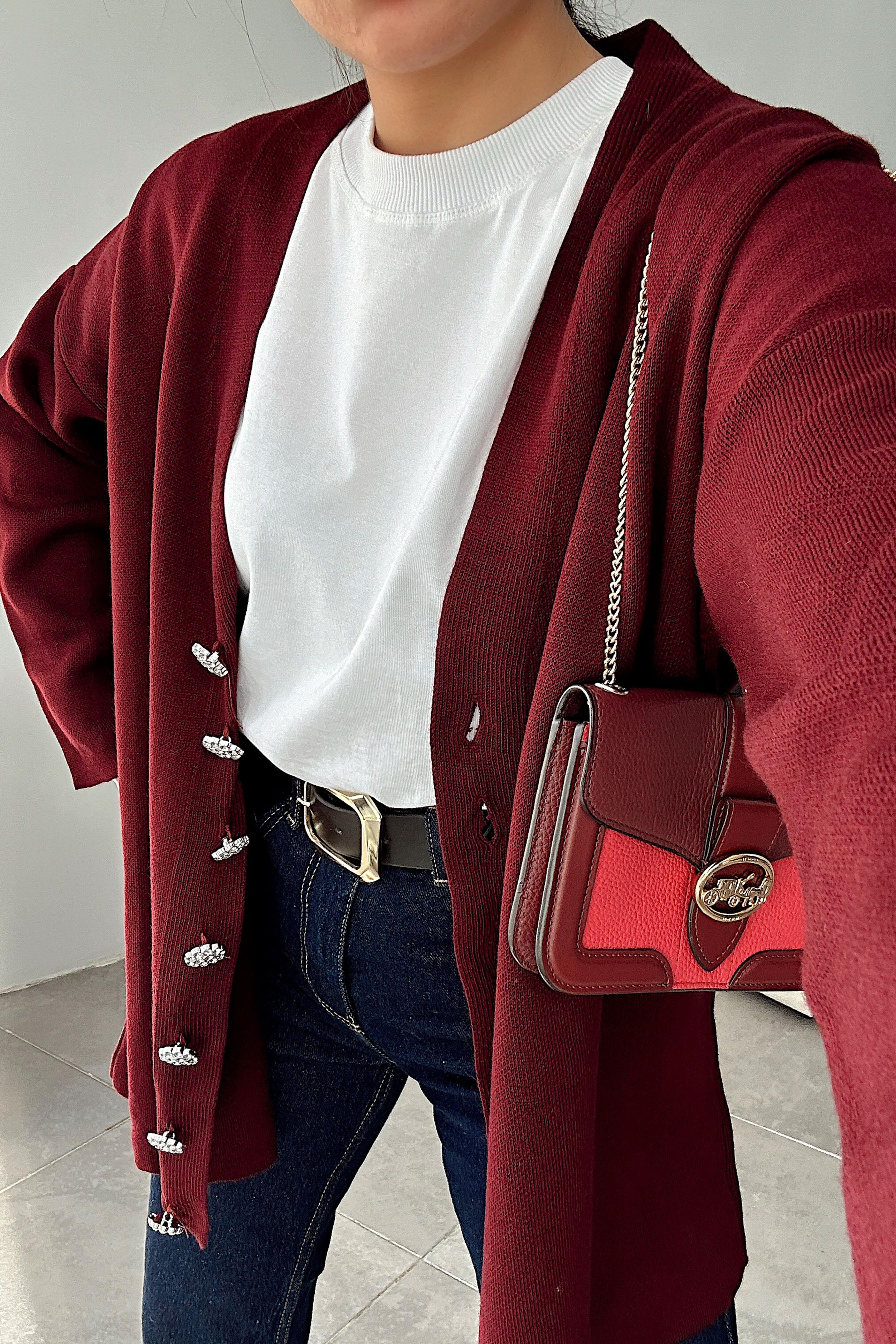 Silver Taş Düğme Detaylı Triko Hırka Bordo